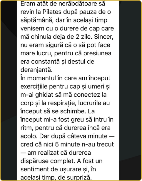 Pilates m-a ajutat să-mi ascult din nou corpul, să-mi eliberez tensiunile și să-mi recapăt conexiunea interioară.
